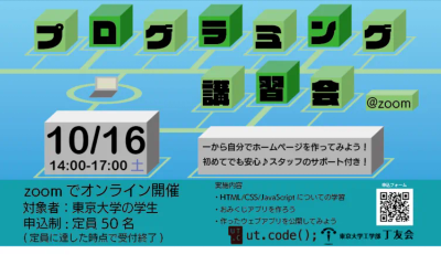ut.code();は、丁友会と合同で、プログラミング教室を開催します。 丁友会は、工学部・工学系研究科の学生の親睦を目的とした団体ですが、このイベントは東京大学・東京大学大学院に所属する学生の方であればどなたでも参加できます。 日程は 【10/16 (土) 14:00 ~ 17:00】です。定員が 50 名と少なめに設定されているので、お早めにお申し込みください。詳細に関しましては以下のリンクか、UTAS の告知をご覧ください。 申し込みする...